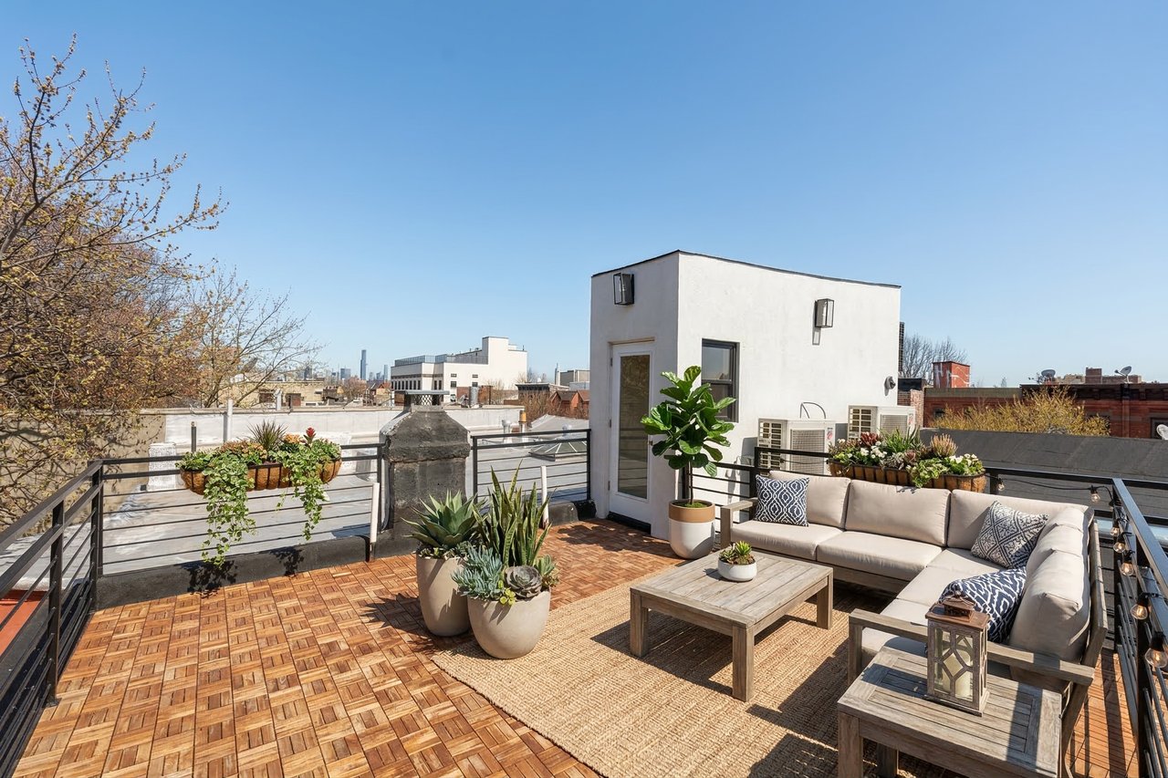 Outdoor living is equally impressive, with a seamless transition from the kitchen to a spacious rear deck overlooking a private 43-foot-deep garden. Above, a finished roof deck provides another inviting setting for entertaining, relaxing, and enjoying open Brooklyn skyline views.
